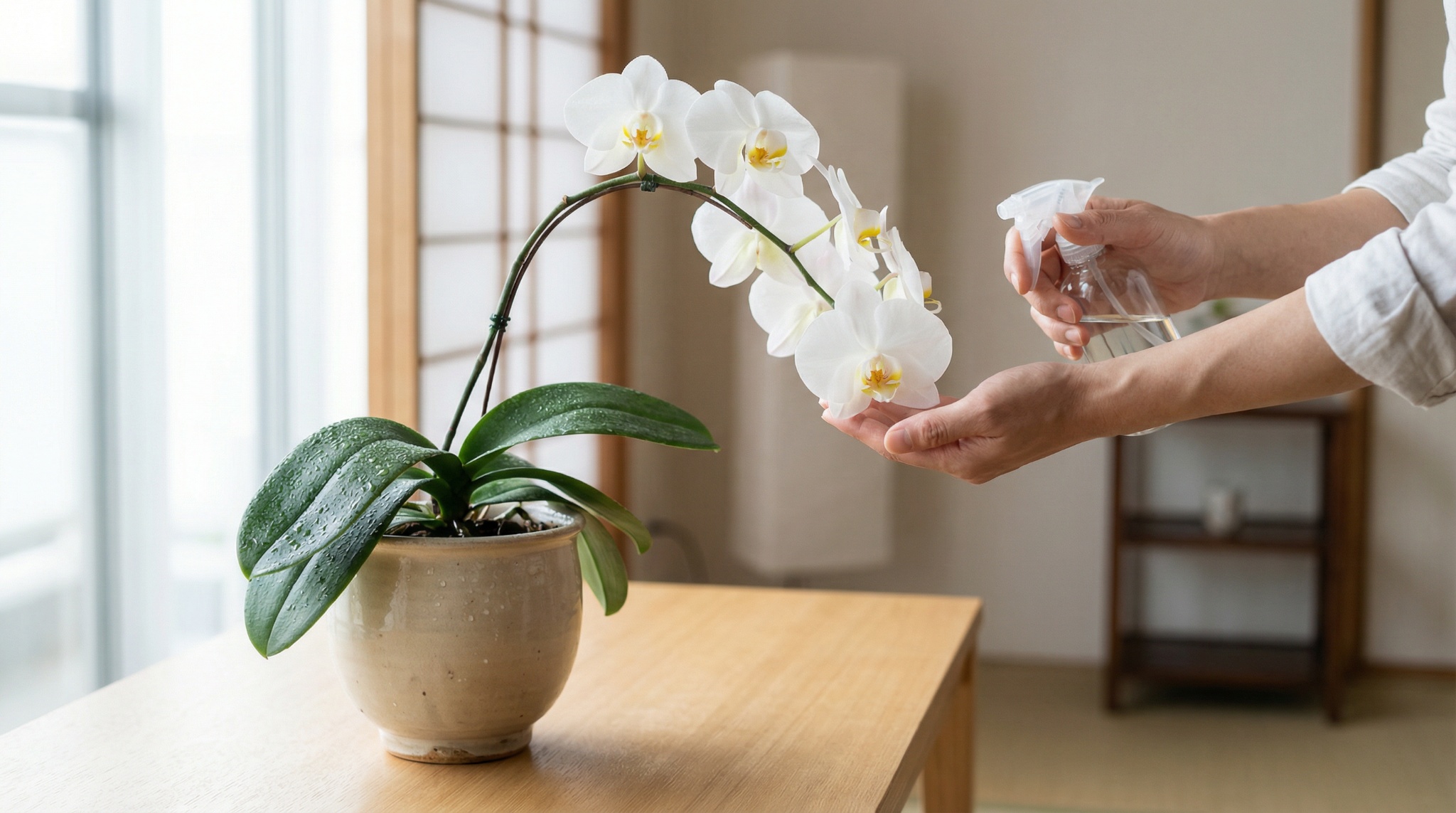 特に冬場など、エアコンで空気が乾燥している場合は、「葉水(はみず)」も効果的です。霧吹きを使って、葉の表と裏に軽く水を吹きかけてあげましょう。これにより、葉からの水分の蒸発を防ぎ、生き生きとした状態を保つことができます。ただし、花に水がかかるとシミの原因になるので注意してくださいね。
